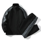 Dit tweedelige herenset, vervaardigd uit een geweven polyestermix, biedt een relaxte pasvorm en is voorzien van een staande kraag en contrasterende streepdetails.
