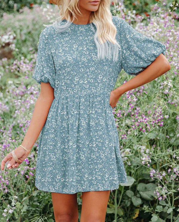 - Ontwerp: A-lijn silhouet, pofmouwen, bloemenprint, ronde hals