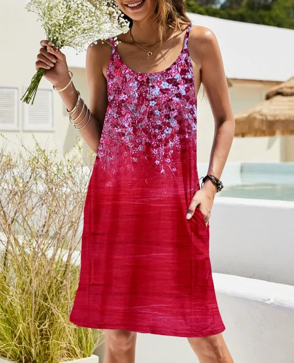 - Ontwerp: A-lijn pasvorm, relaxte snit, spaghettibandjes, ronde hals, knielengte, met zakken
