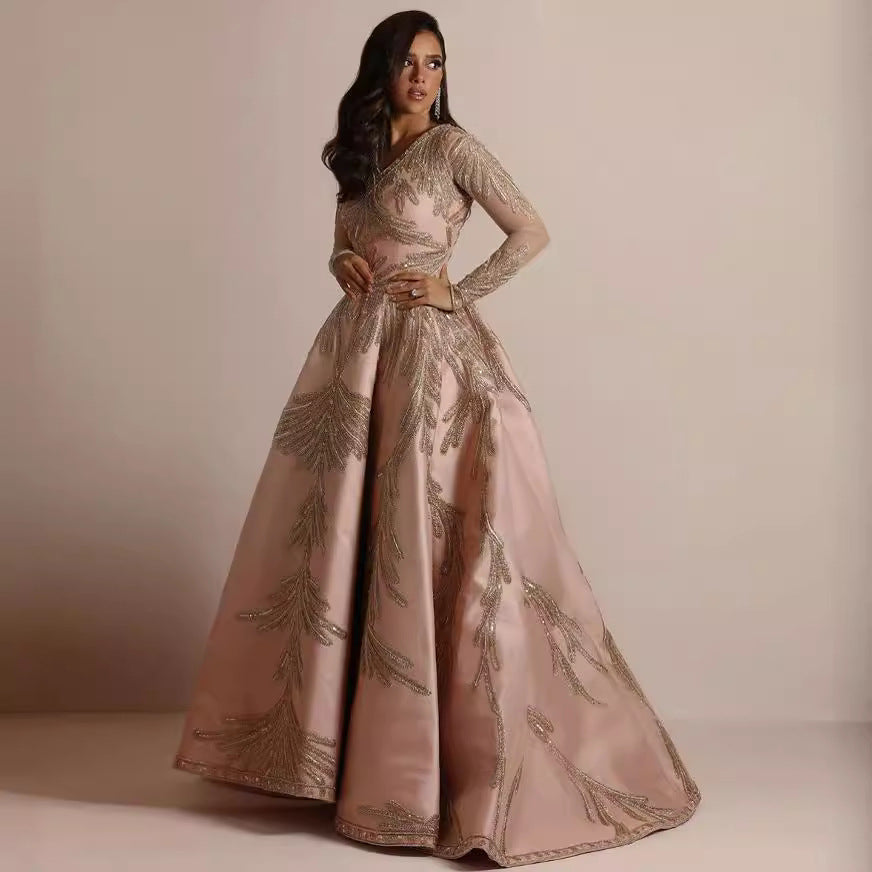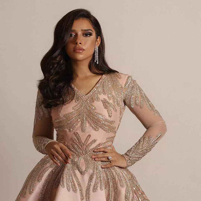 - Ontwerp: Elegante avondjurk met diepe V-hals, lange mouwen en een wijd uitlopende rok, volledig versierd met een symmetrisch paillettenpatroon.