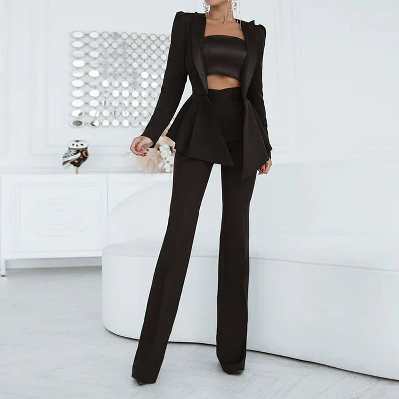 Draag deze Dames Blazer Set met de bijpassende getailleerde broek voor een complete, professionele look. Voor een avondevenement combineer je het met elegante hakken en minimalistische sieraden voor een verfijnde uitstraling.