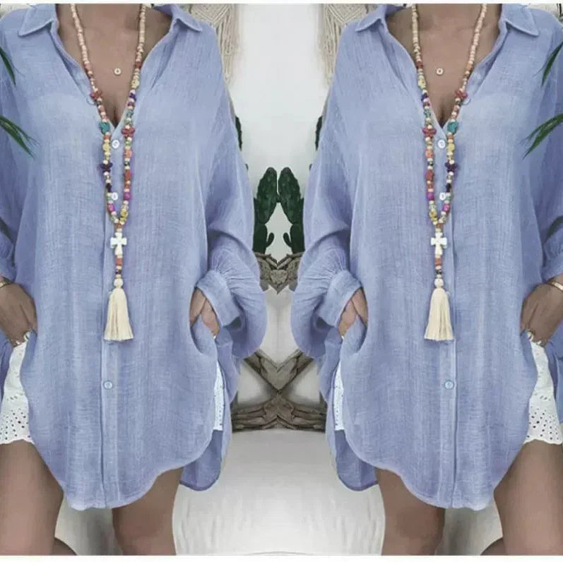 Ontdek de Dames Blouse – Oversized Pasvorm – Katoen Linnen – Lange Mouw – Doorknoop Tuniek van Modehuis Julie. Deze comfortabele, ademende tuniek biedt een ontspannen, flowy silhouet voor elke casual gelegenheid. Perfect voor de moderne vrouw die stijl en comfort zoekt, ideaal als casual outfit of strand cover-up.