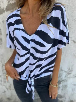 - Ontwerp: Relaxed fit, V-hals met strikdetail en korte mouwen