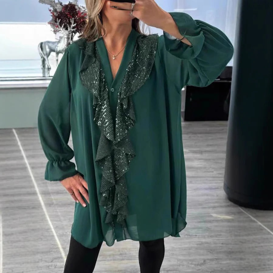 Ontdek de Dames Blouse – Transparante Stof – Relaxed Fit – Lange Mouwen – Ruffle met Glans. Deze elegante blouse met doorschijnende stof, comfortabele pasvorm en glanzende ruffle is perfect voor semi-formele avonden.