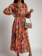 Ontdek de Dames Jurk – V-Hals – Soepel Model – Tailleceintuur – Midi – Lange Mouwen – Print van Modehuis Julie. Een elegante en comfortabele jurk met flatterende V-hals, soepele pasvorm en verstelbaar tailleceintuur. De levendige print en midi-lengte maken deze lange mouwen jurk perfect voor diverse gelegenheden.