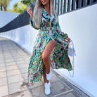 - Ontwerp: Soepel vallend met V-hals, tailleceintuur, split en abstracte print